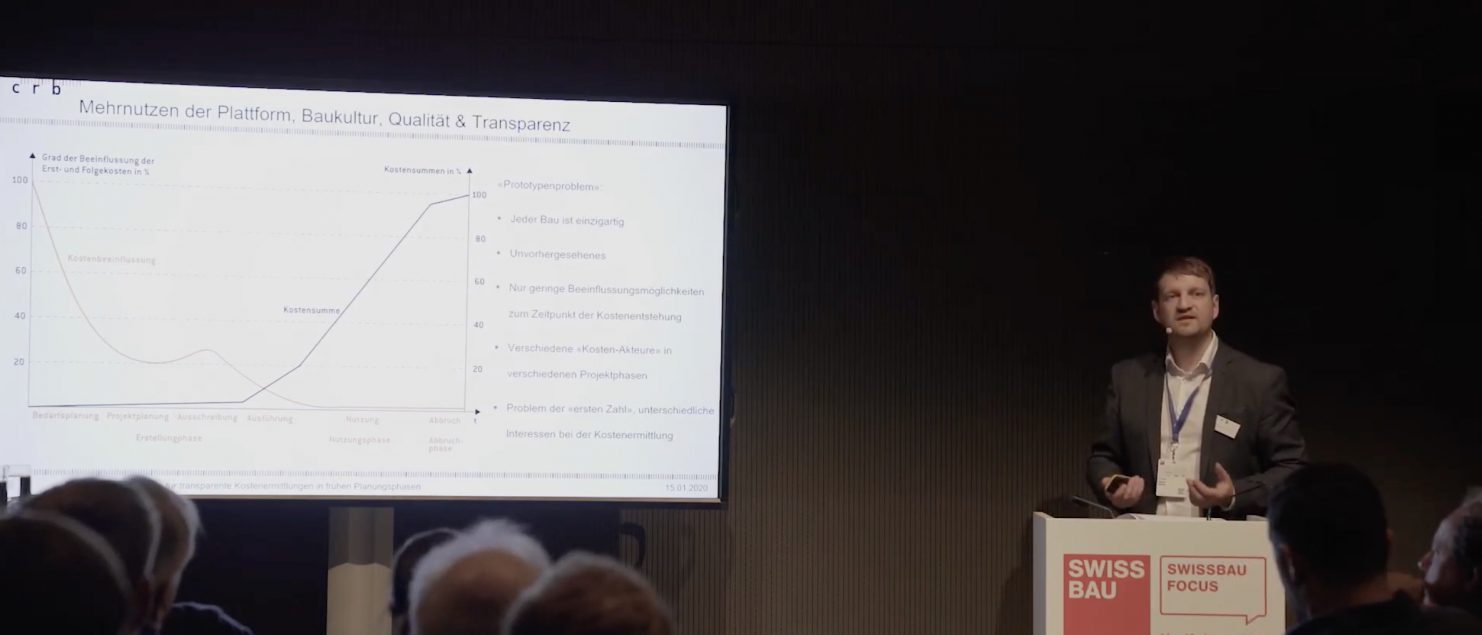 // On January 15th. 2020, Hannes Reichel discussed building cost indexes and cost- controlling in the early project stages at the largest Swiss Construction Exposition «Swiss Bau» in Basel together with Tibor Joanelly of the magazine werk, bauen + wohnen, Romain Lerch and Robert Larocca of the Swiss Federal Statistical Office, moderated by György Orbán of the CRB. He stressed the importance of the architect as «keeper of the cultivation of architecture», which always has to be present when talking about construction costs.