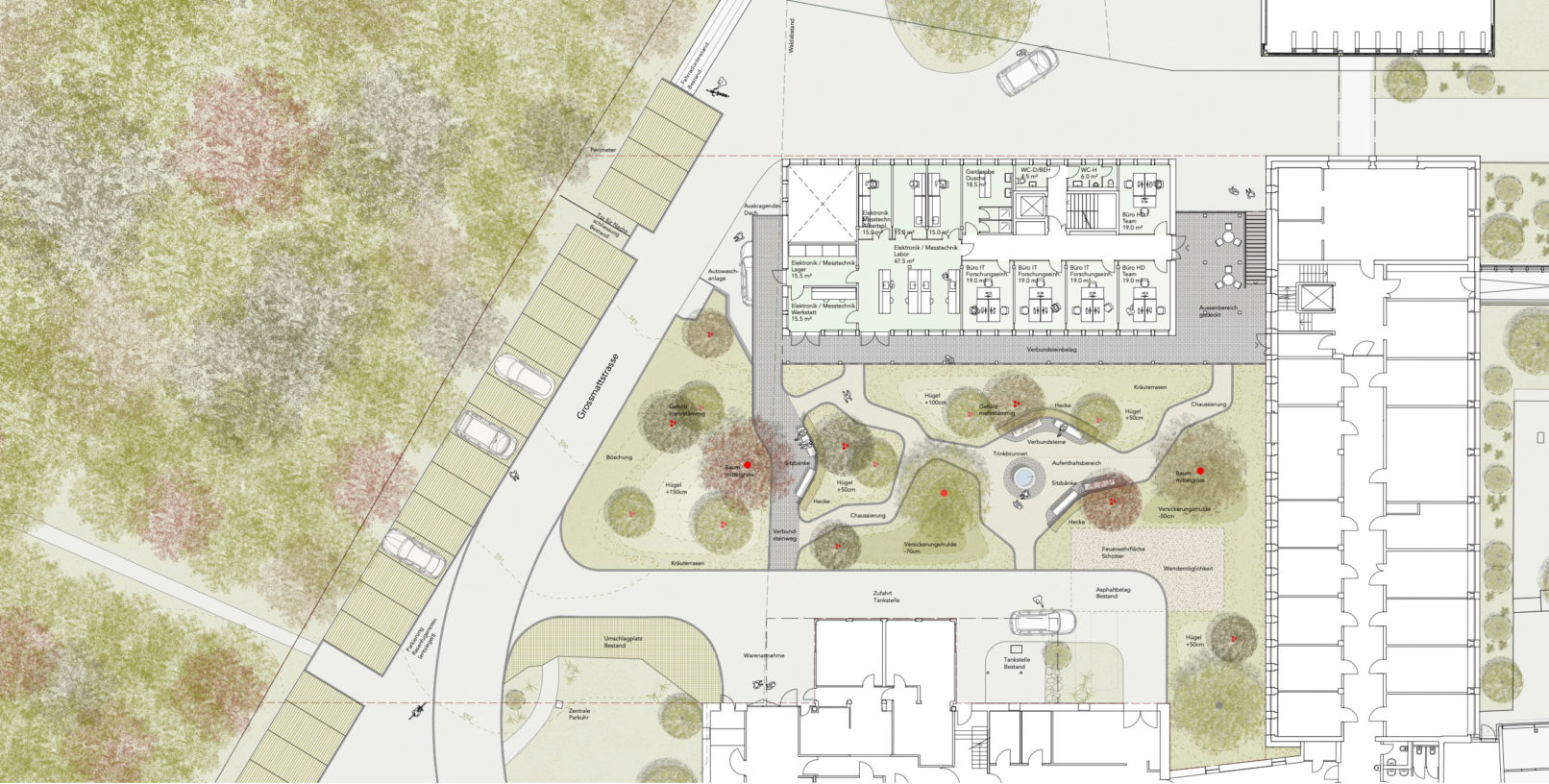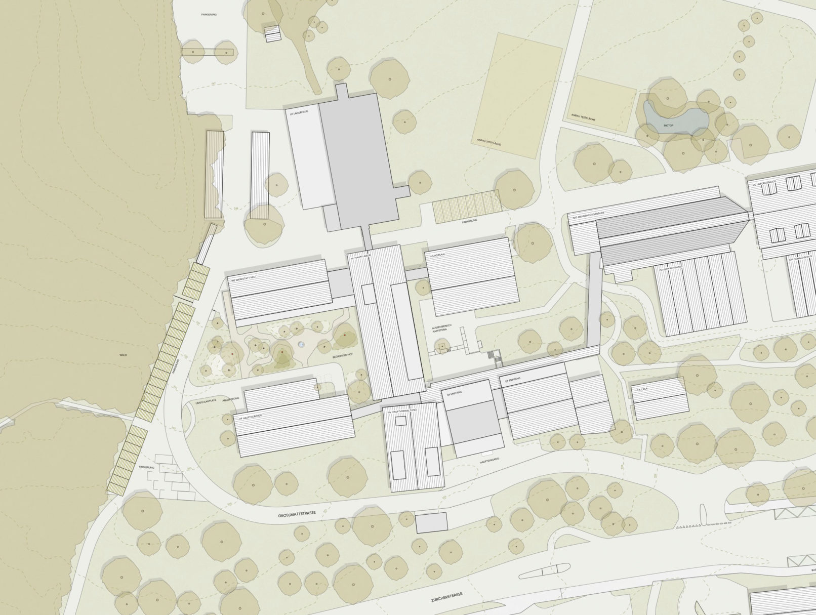 Der Ersatzneubau wird als Fortsetzung des bestehenden Campus Birmensdorf gedacht, die bestehenden Wegeverbindungen und Setzungen der einzelnen Gebäude auf dem Gelände werden mit dem Neubau ergänzt. Der Neubau nimmt die Ausrichtung der orthogonalen Gebäudestellung auf und wird Teil des bestehenden Campus.