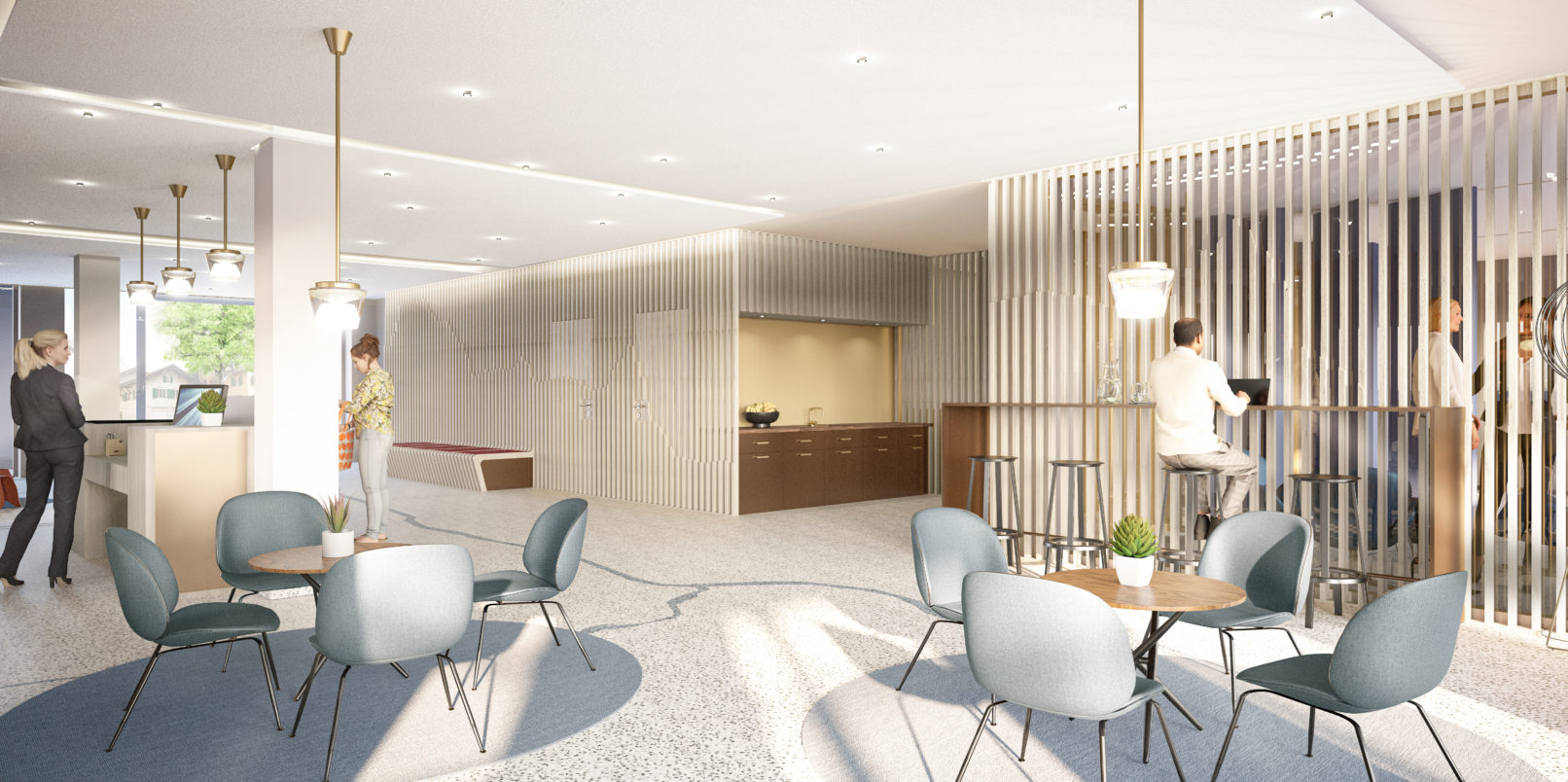 Ohne Änderungen der Wertezone wird im neuem Raumkonzept die freie Wahrnehmbarkeit der Filiale neu definiert. Ein grosszügiger und heller Bereich zwischen der strassenseitigen Fassade und den Wintergarten bildet die neue 24-Zone und den Kundenbereich.