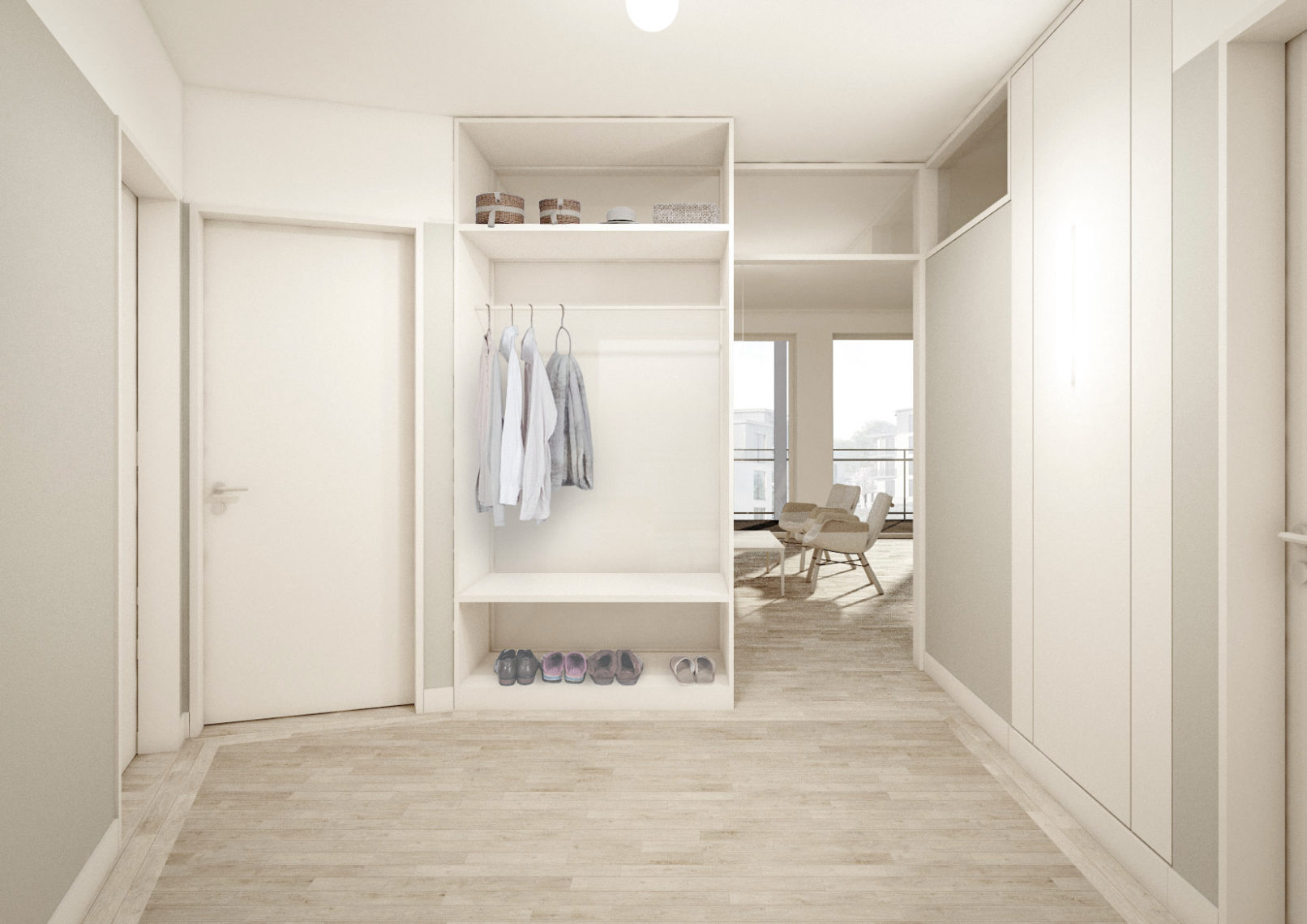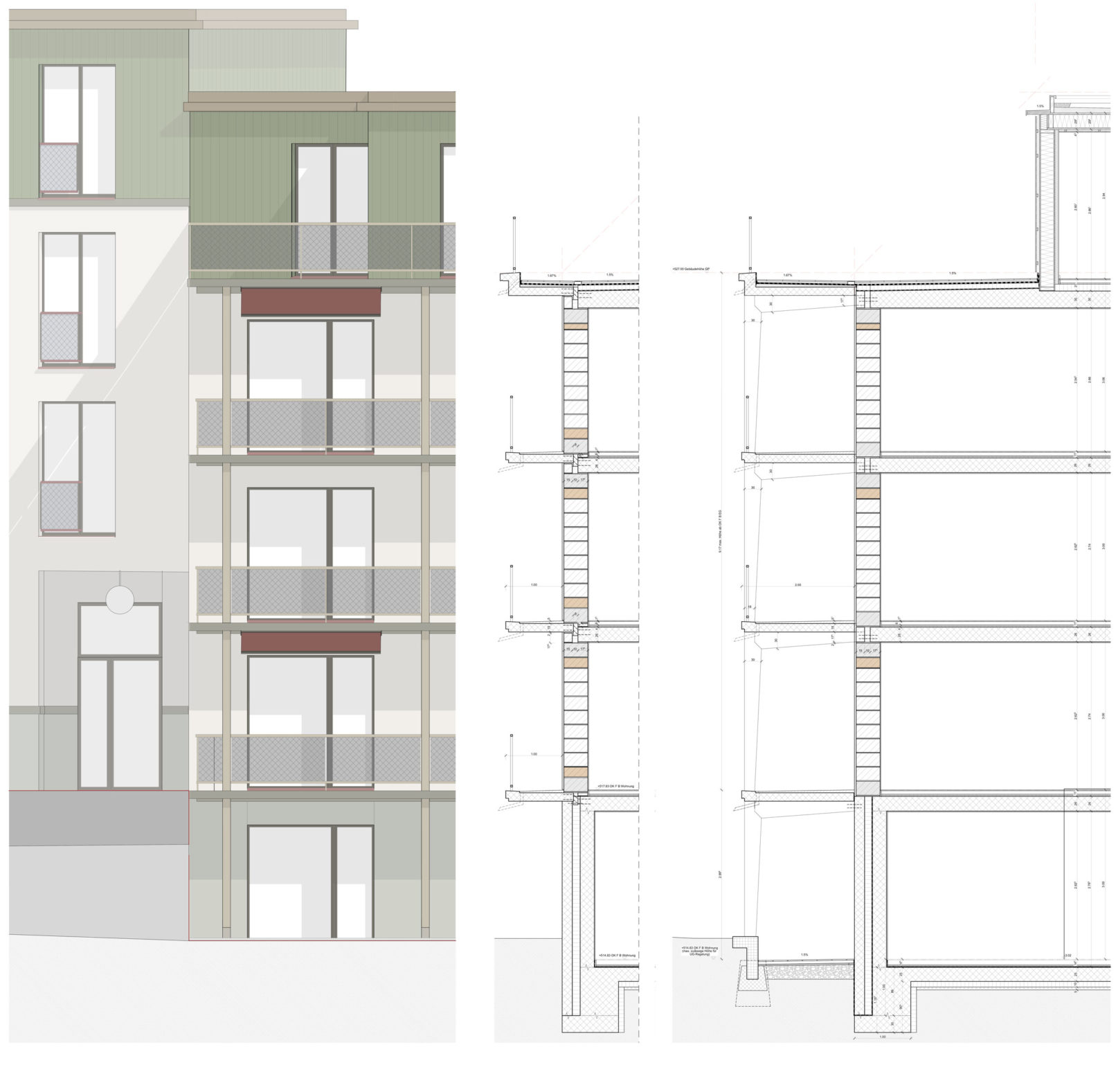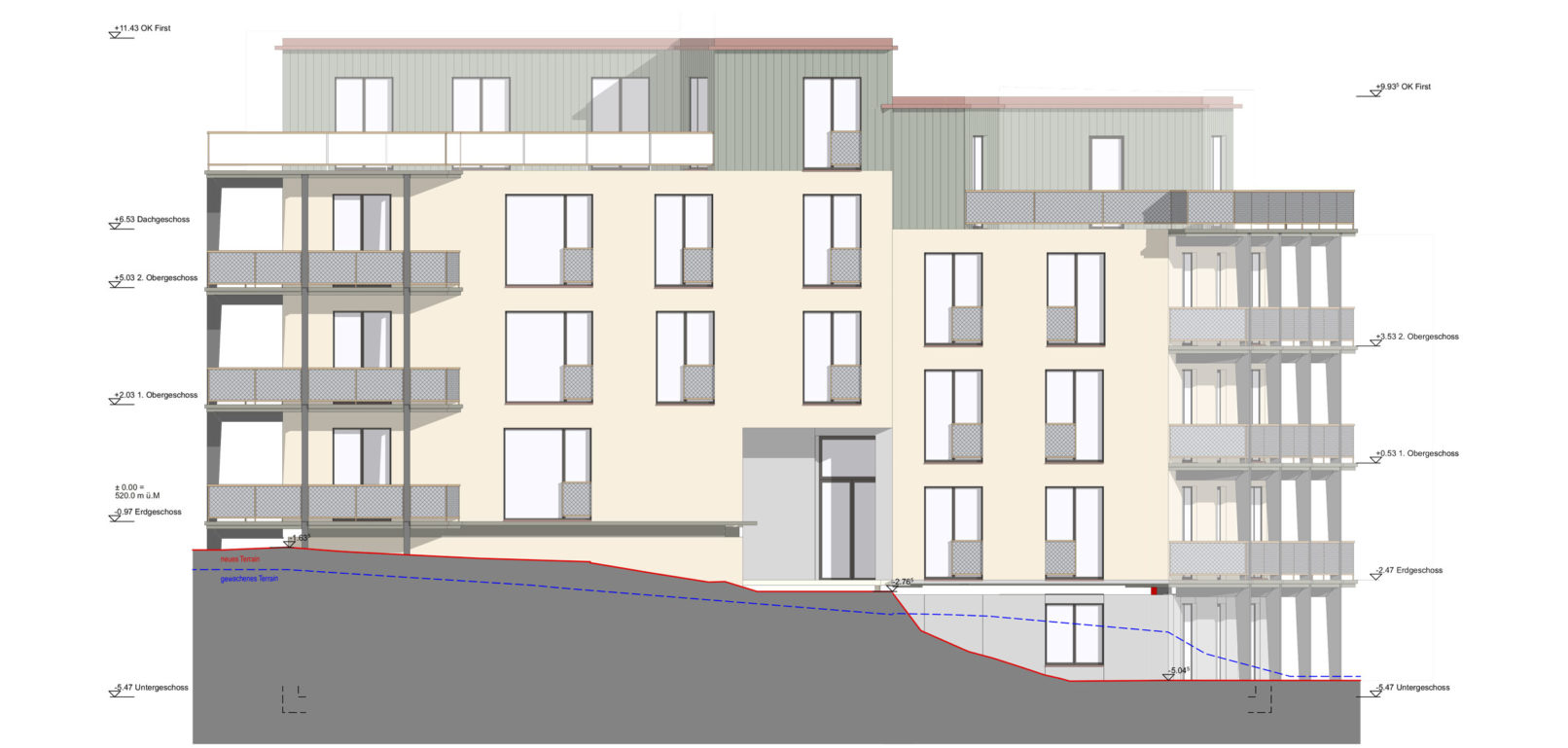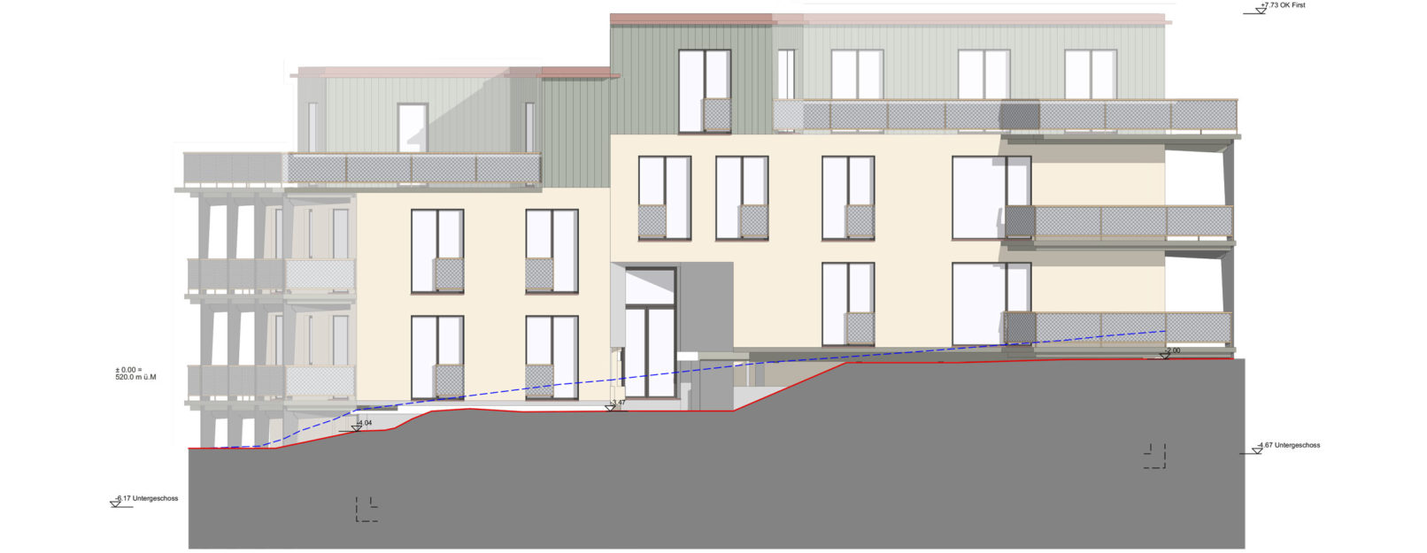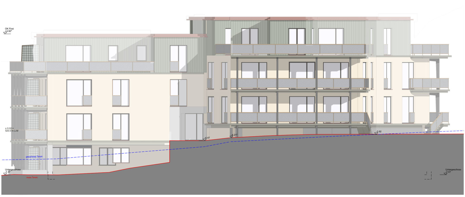 Die ca. 100 Familien- Mietwohnungen und 5 Gewerbeeinheiten (Co-Working Spaces im EG an der Schachenstrasse) sollen in Einsteinmauerwerk mit Attikaaufbauten aus Holzelementen erstellt werden.