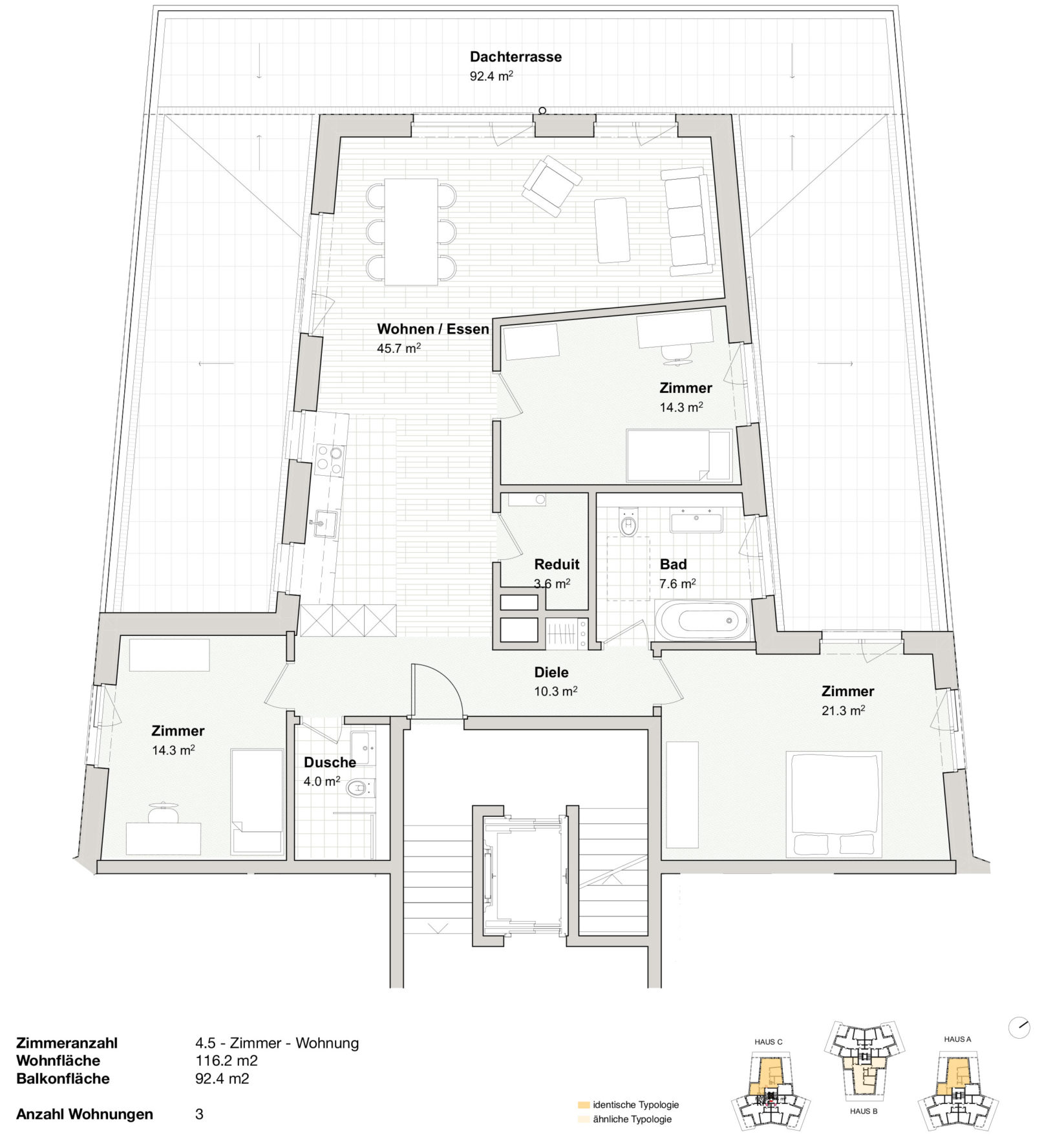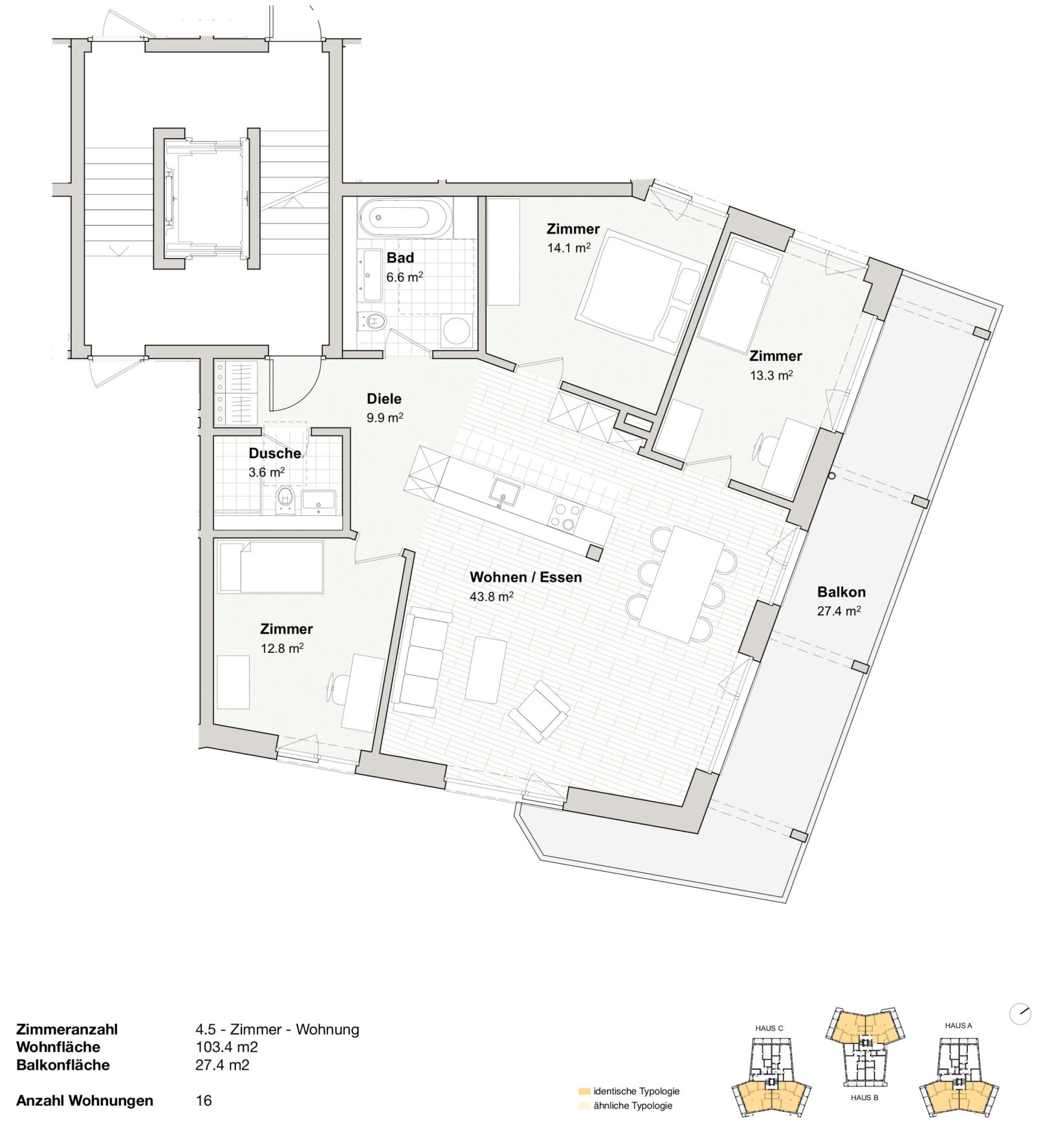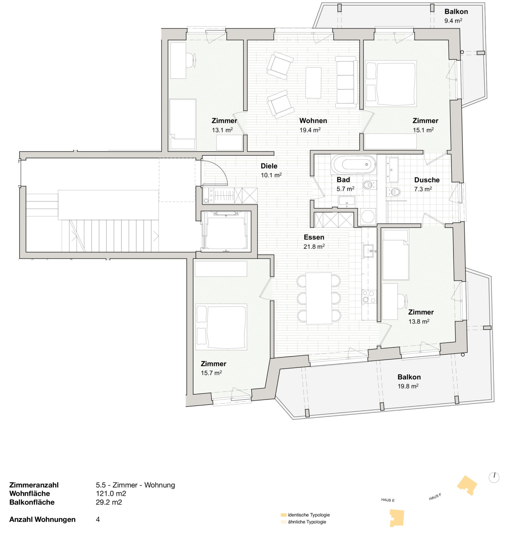 Die Wohnungen entlang der Schachenstrasse sind mehrheitlich als Durchwohn-Typologien konzipiert, um dem Sportbetrieb auf den Fussballplätzen vis-à-vis auszuweichen, wohingegen die Wohnungen in den Flügelbauten dreiseitig orientiert sind.