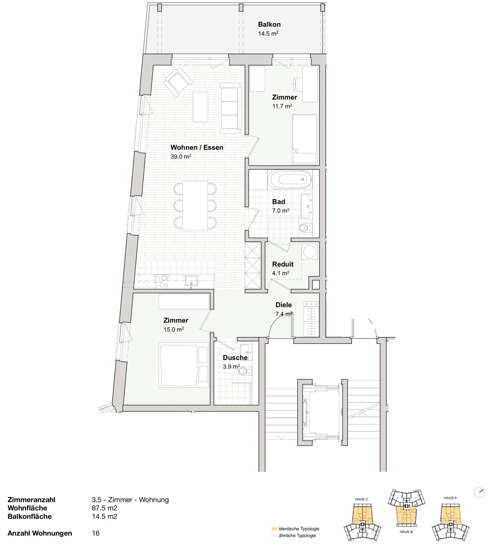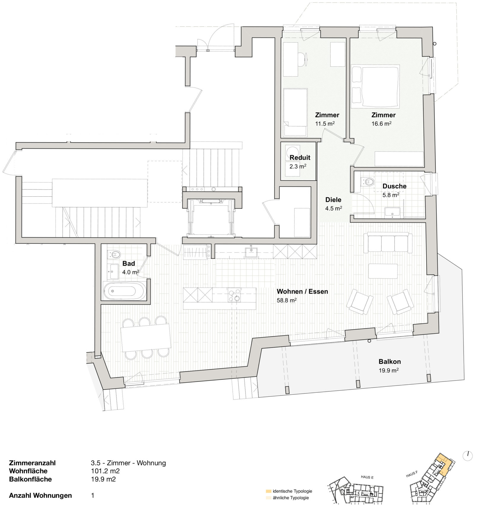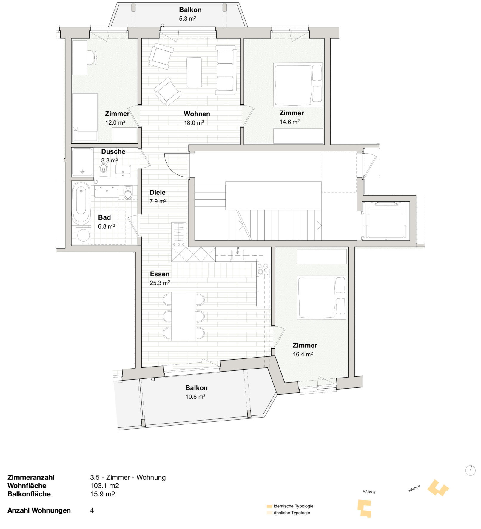 Die Wohnungen entlang der Schachenstrasse sind mehrheitlich als Durchwohn-Typologien konzipiert, um dem Sportbetrieb auf den Fussballplätzen vis-à-vis auszuweichen, wohingegen die Wohnungen in den Flügelbauten dreiseitig orientiert sind.
