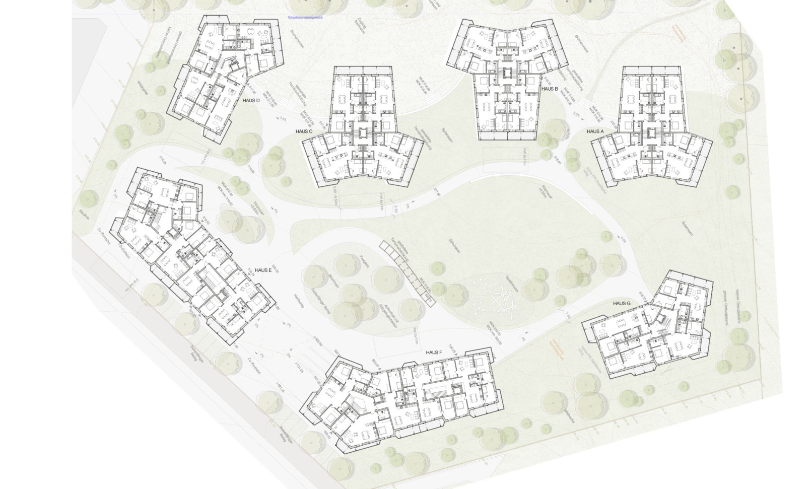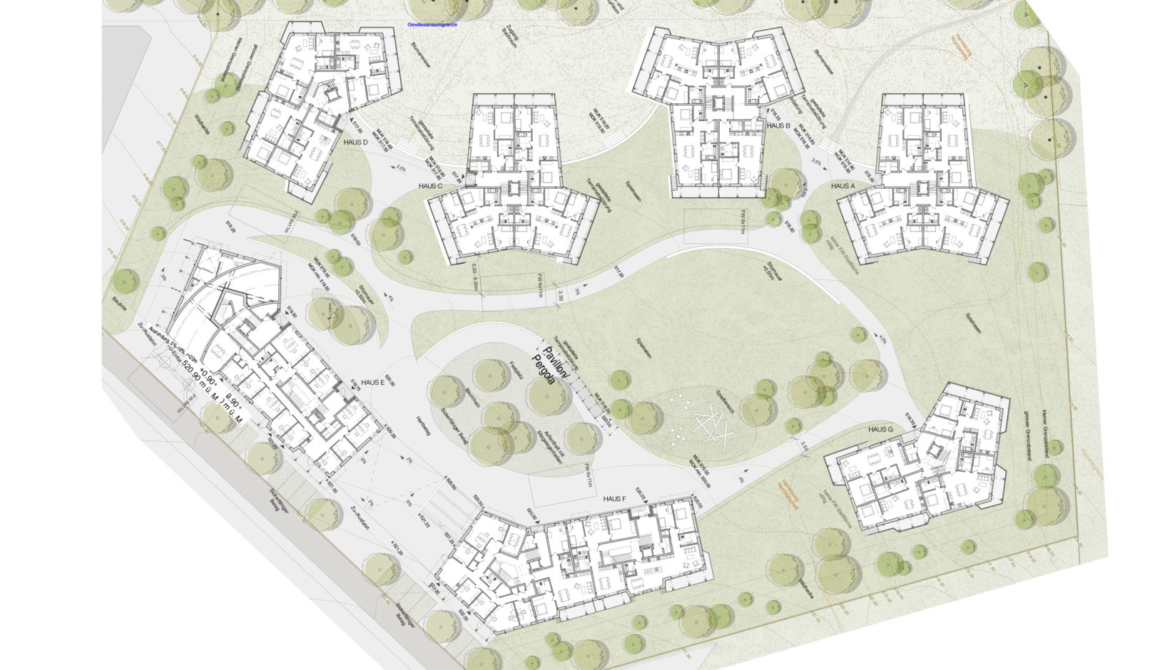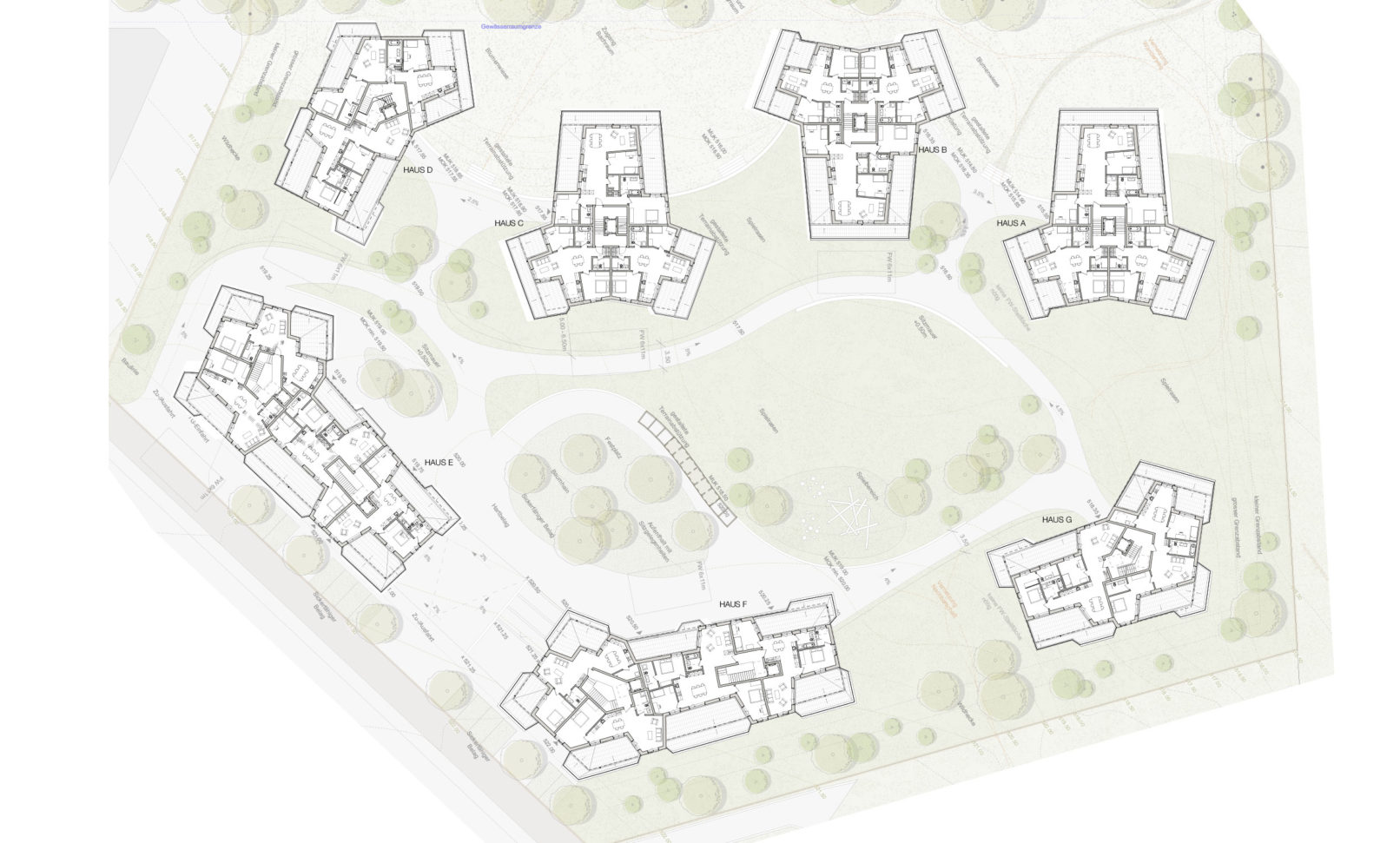 Die sieben Volumen sind in der Höhe gestaffelt angeordnet, um die ca. sieben Meter Terrainunterschied von Süd nach Nord sanft aufzunehmen. Ein gemeinsamer, grosszügiger Innenhof schafft Blickbeziehungen zum Strassenraum, sowie zur Landschaftszone im Norden und geht sind in die halbprivaten Nischen zwischen den Volumen über.