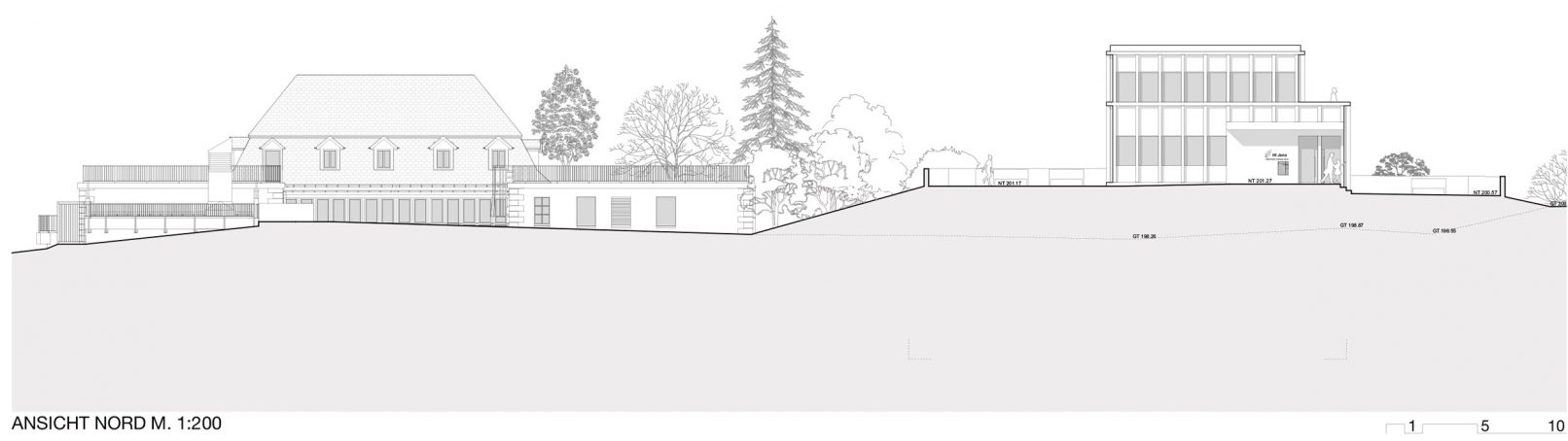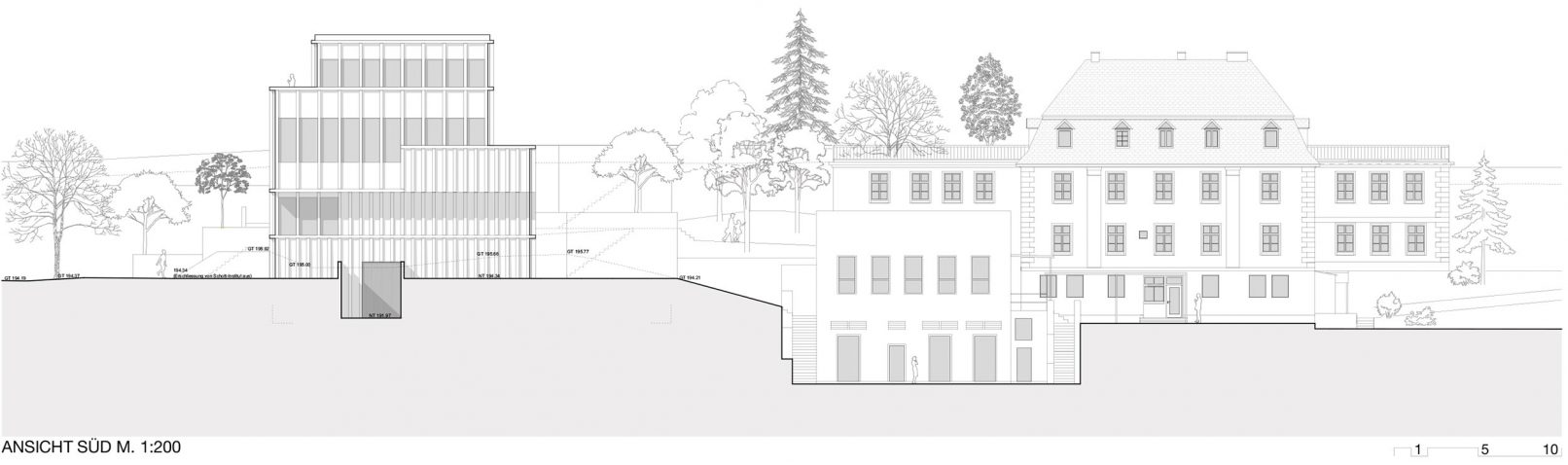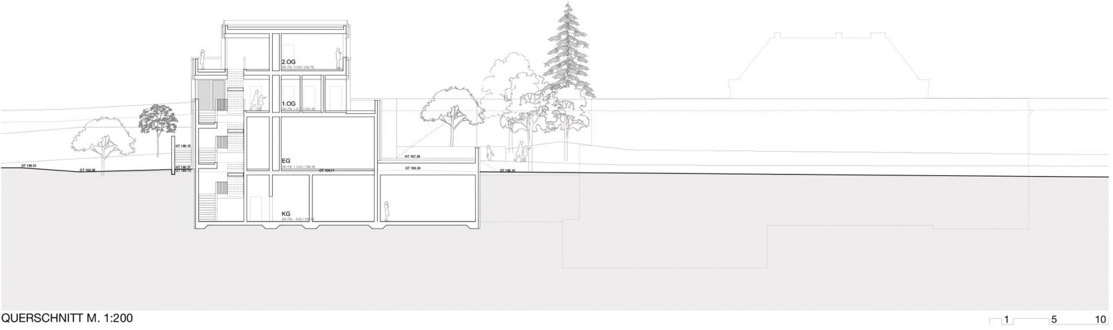 Typologisch tritt er ambivalent in Erscheinung: Von der hoch gelegenen Fraunhoferstraße wirkt er durch die schmale, abgetreppte Silhouette fast wie eine der Villen am Hang, vom tiefer gelegenen Niveau aus aber tritt seine eigenständige Form voll in Erscheinung und bildet so einen klar definierten nördlichen Abschluss des Hochschulkarrees.