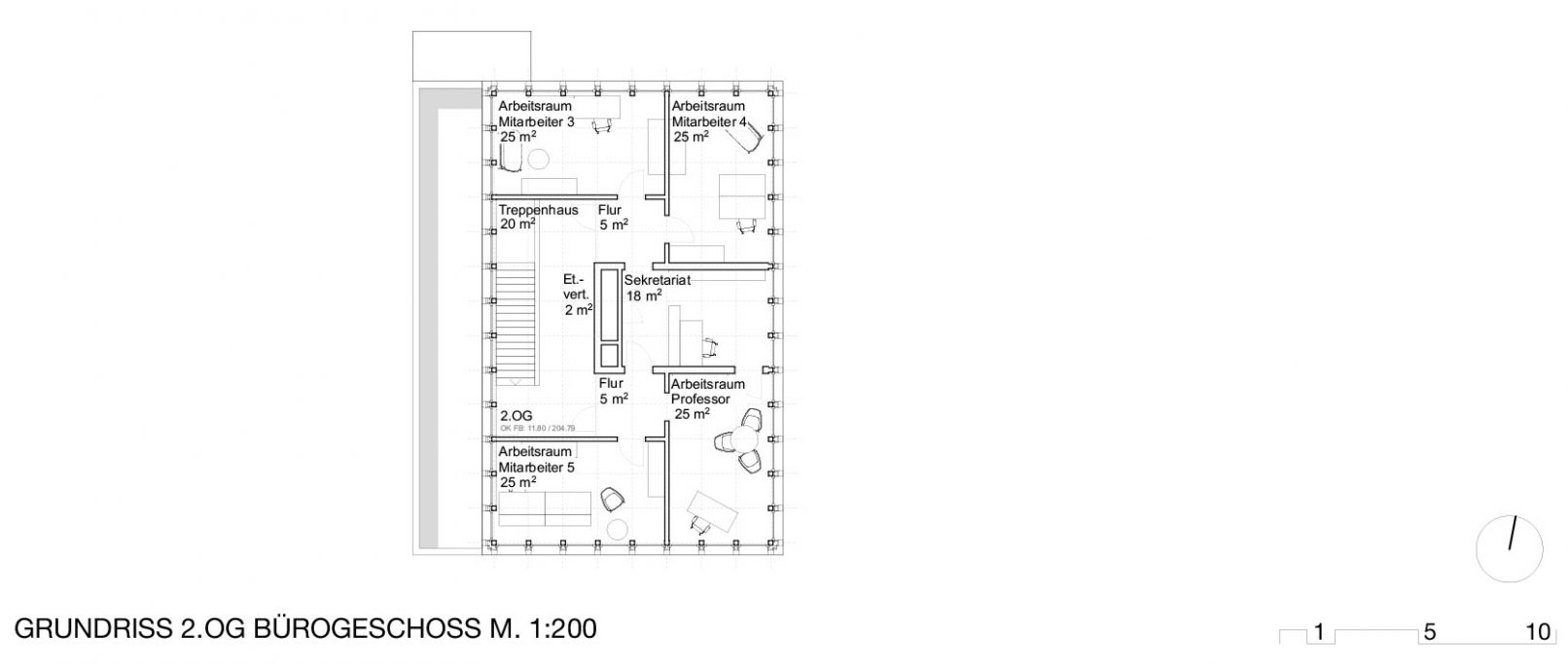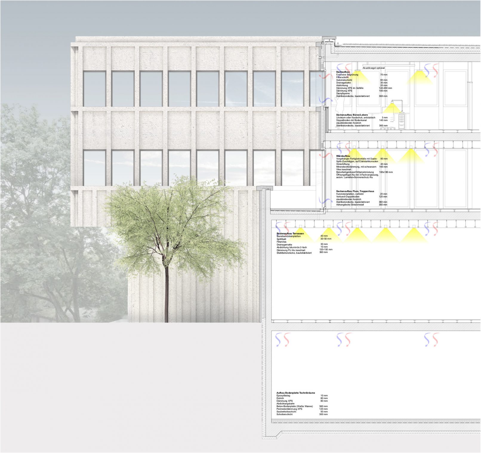 Das relativ kleine Programm mit seinen vielen spezifischen Einzelräumen, von denen nur einige eine natürliche Belichtung benötigen, macht klassische Organisationslösungen von Bürobauten, wie Kern- und Mischzonen-Aufteilung nur bedingt anwendbar, weshalb für den Neubau eine Mischform aus einem klaren Konstruktions- und Ausbauraster von 1.25m, Doppelböden, teilweise Abhangdecken auf der einen Seite und einer eher Wohnhausartigen Erschliessung und Zellenanordung andererseits gewählt wurde. Dadurch können die Büros und Labore die erforderliche Flexibilität und Standardisierung aufweisen, verbunden mit einer effizienten, repräsentativen und angenehmen Erschliessung.