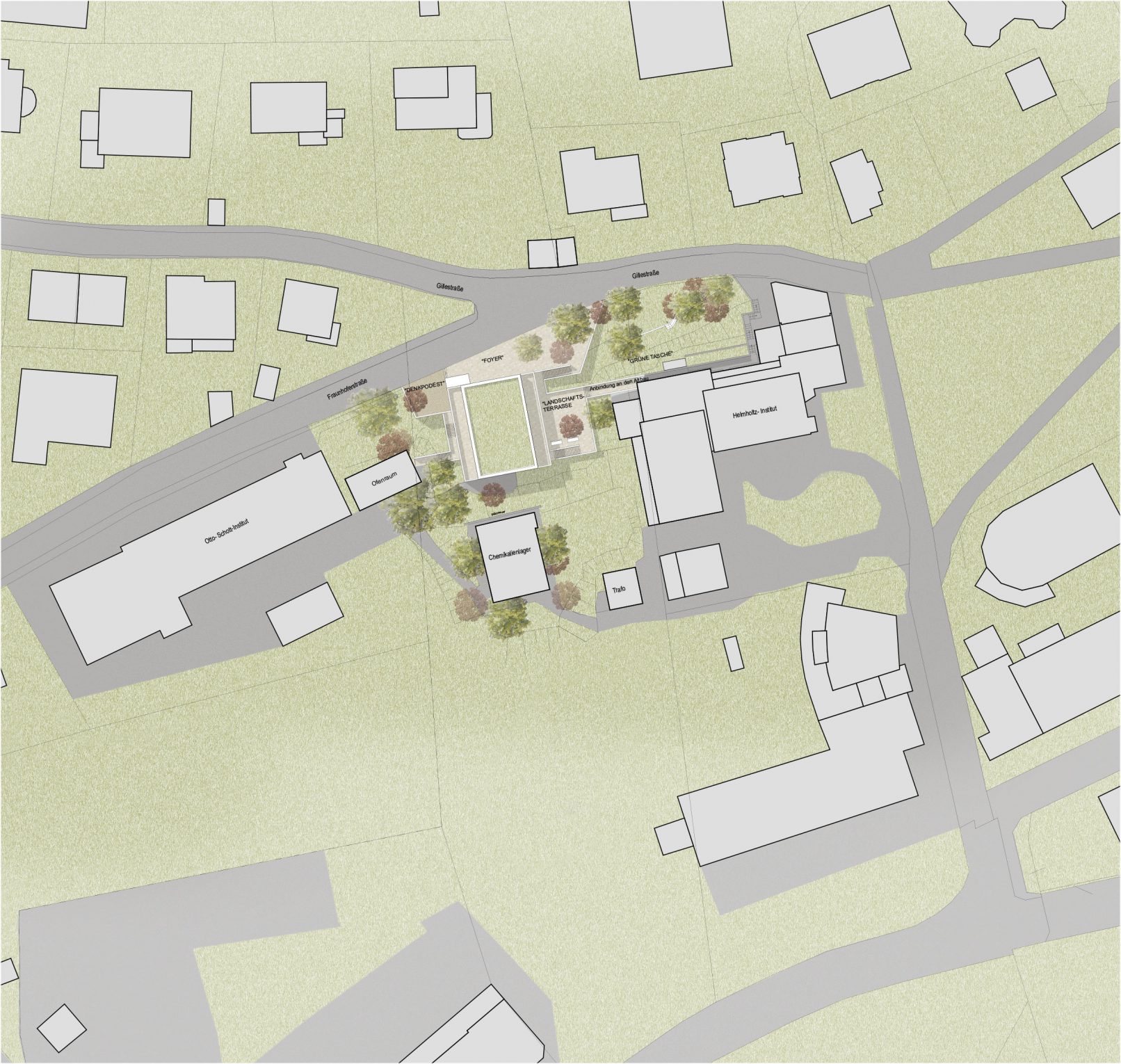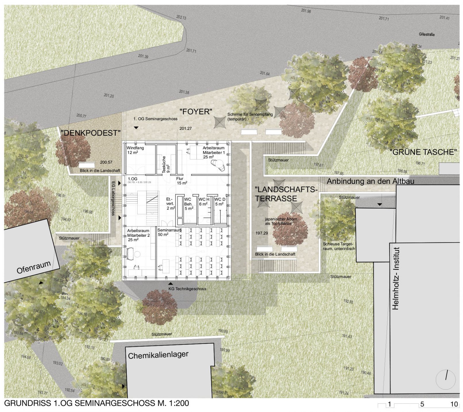 Städtebaulich gliedert sich der Instituts- Neubau in die lockere Bebauungsstruktur der Villen im Landgrafenviertel ein und schliesst gleichzeitig den Kreis der Hochschulbauten des Karrees zwischen Fraunhofer-, Lessingstraße, sowie Am Steiger und dem Fröbelstieg.