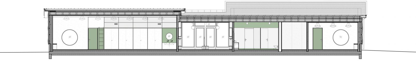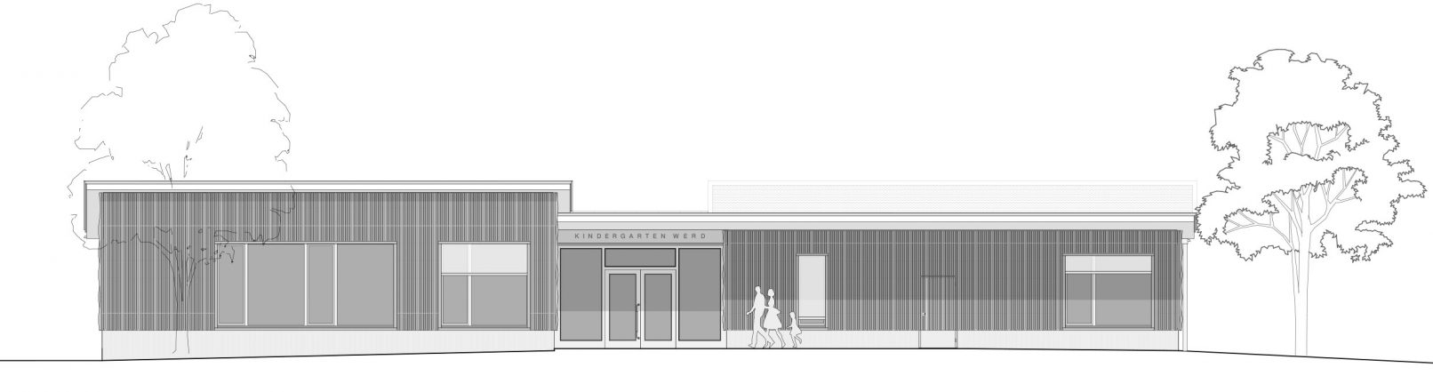 Ein kleiner Versatz im Gebäude gliedert das Volumen in zwei Teile und schafft räumlich eine Fassung für die Eingangsbereiche mit Vordach. Mit dieser volumetrischen Gliederung reagiert der Kindergarten auf die bereits bestehende Staffelung der Bestandesbauten auf dem Schulareal Werd. In jedem Teilbereich des Kindergartens ist je ein Klassen- und Gruppenraum mit Nebenräumen vorgesehen. Die Garderobe des Kindergartens wird vom Haupteingang am Schönauweg, als auch vom Ausgang zur Spielwiese/ Hort direkt erschlossen.
