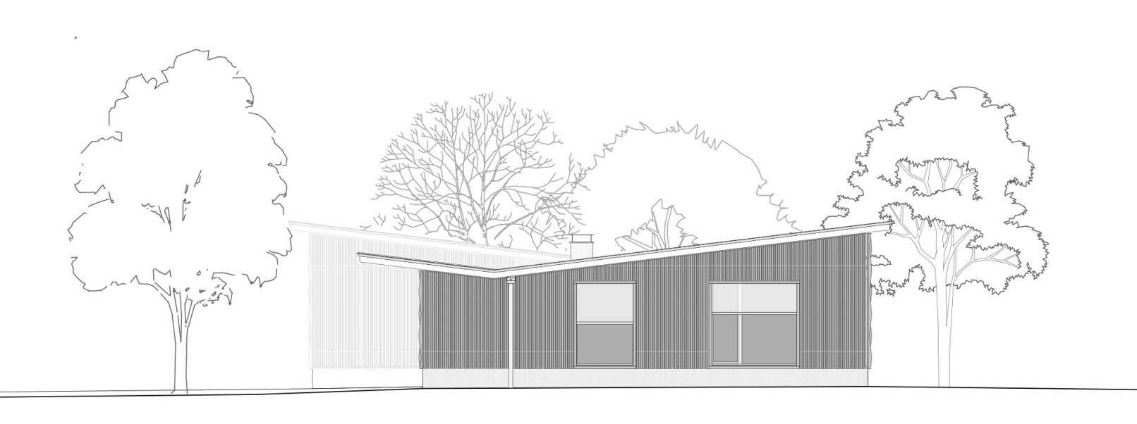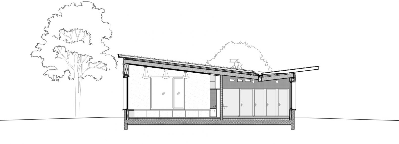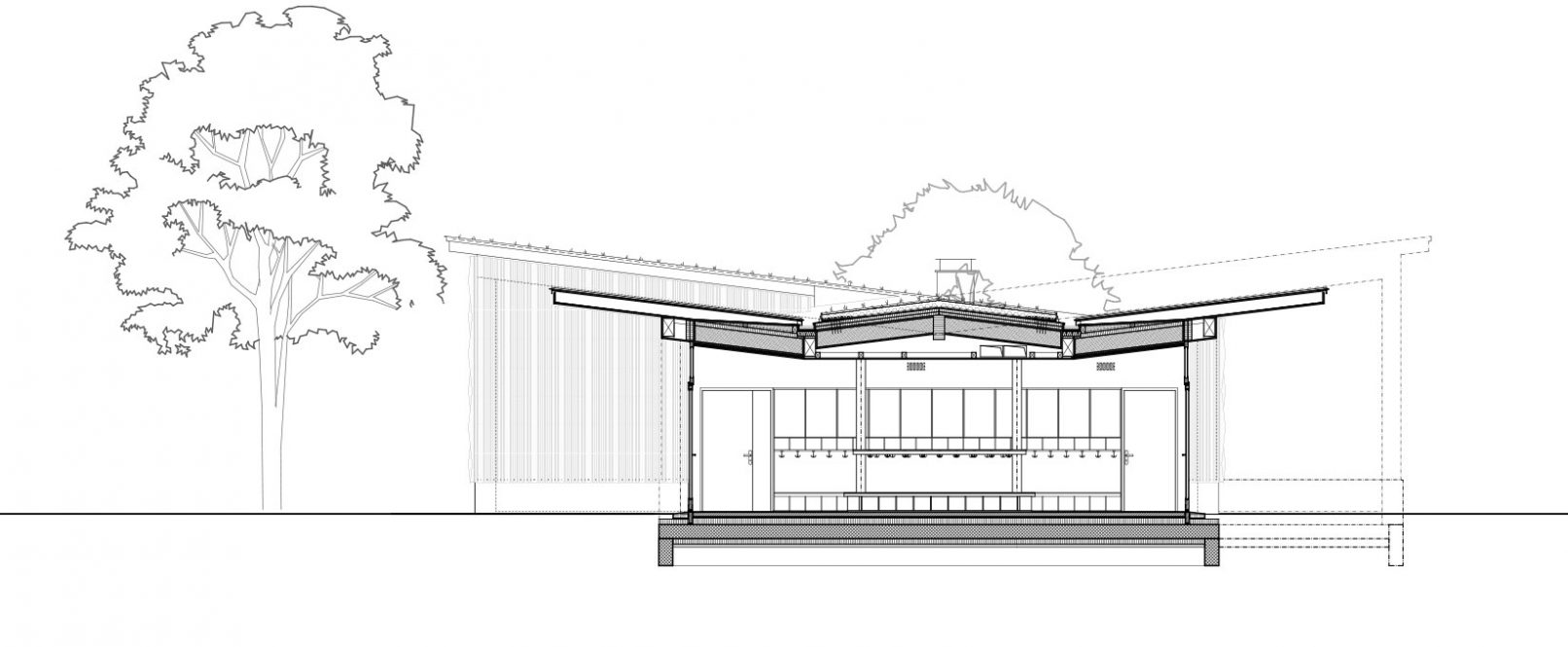 Der Sockel aus Recyclingbeton schafft den nötigen Höhenunterschied zum Terrain, um den Holzbau vor Nässe zu schützen und bindet den Bau in die Hartbelagsflächen der Umgebungsgestaltung ein.