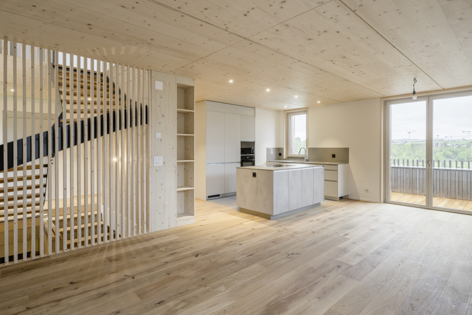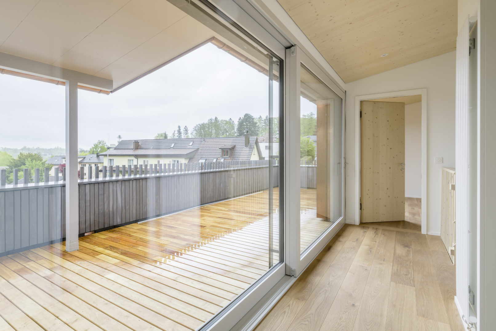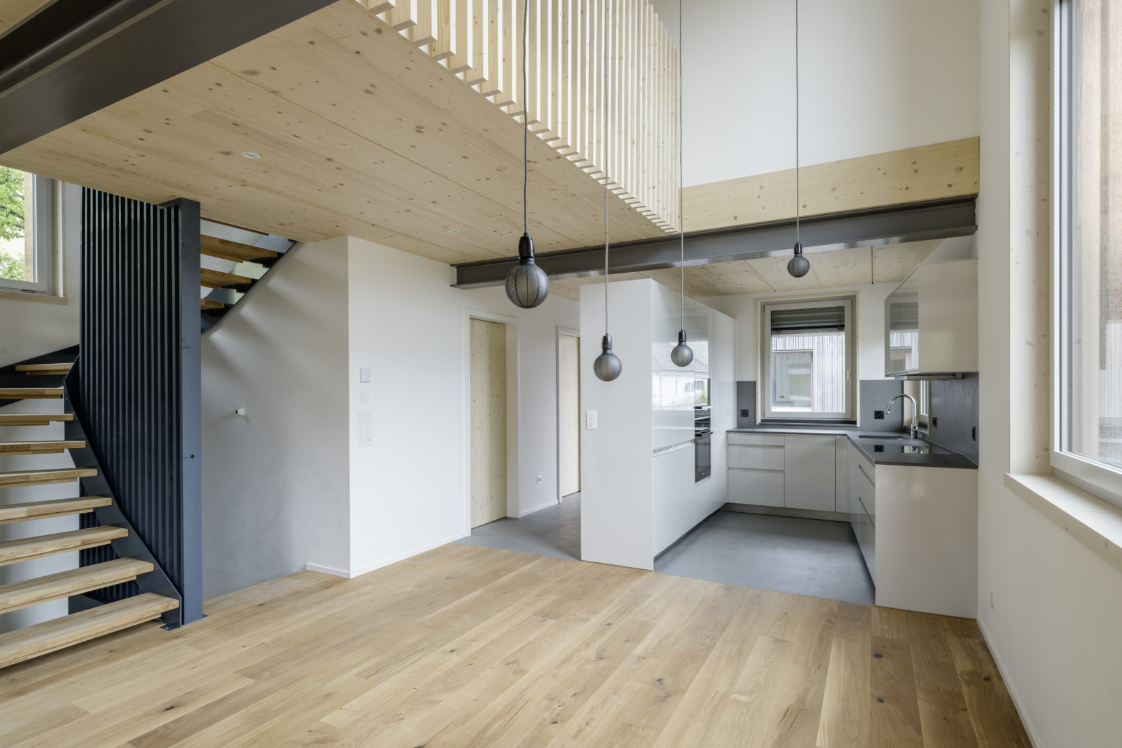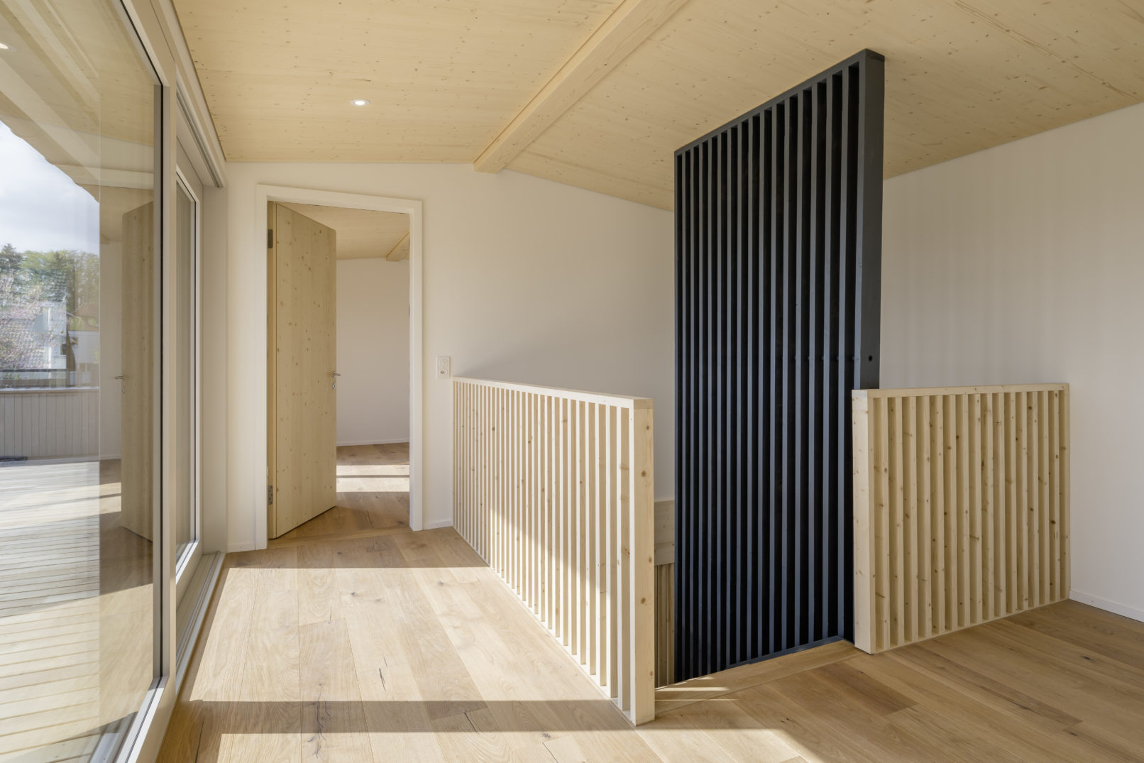 Die Holzkonstruktion besteht aus vorgefertigten Holzwänden und Lignaturdecken mit Perlitschüttung als Schalldämmung