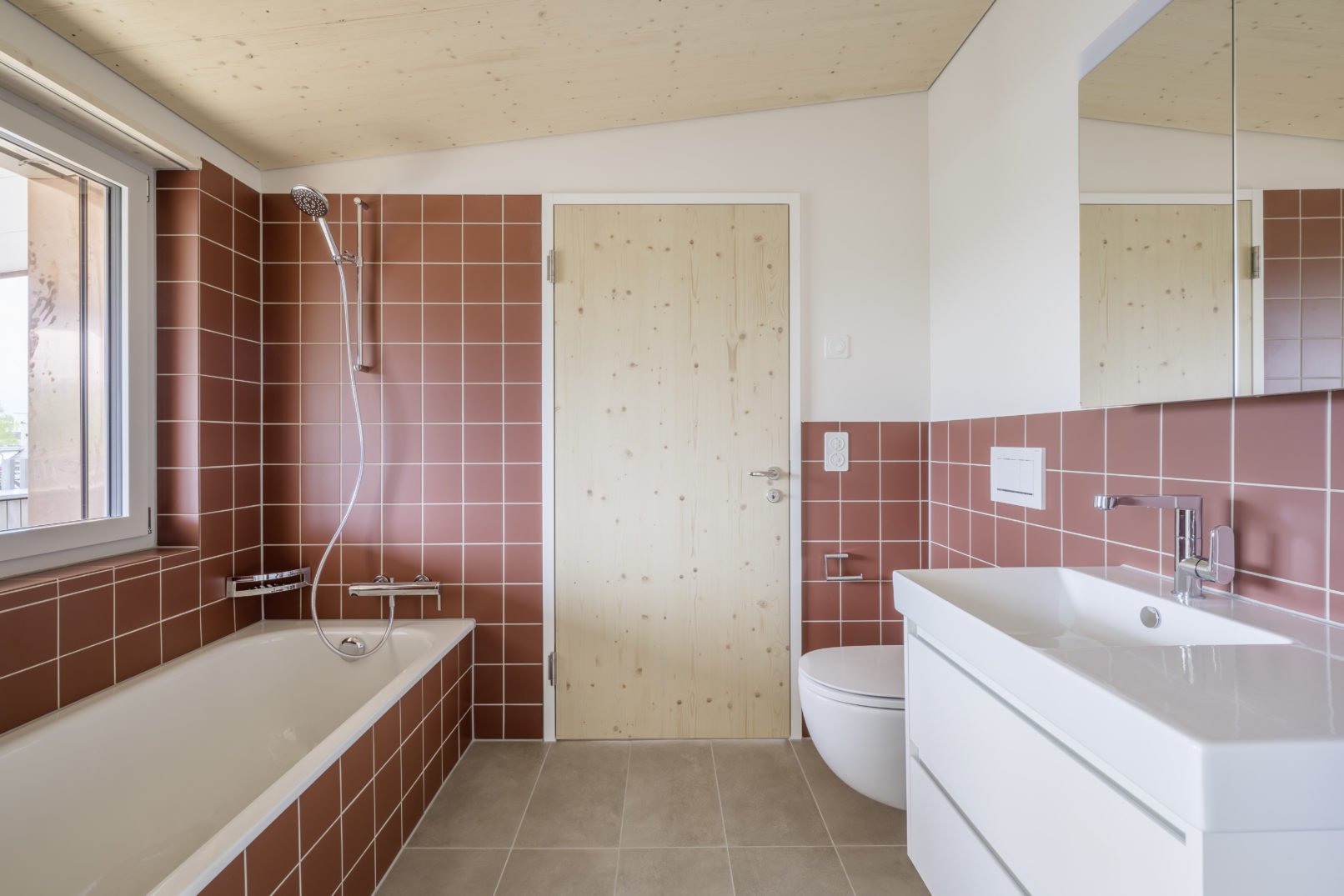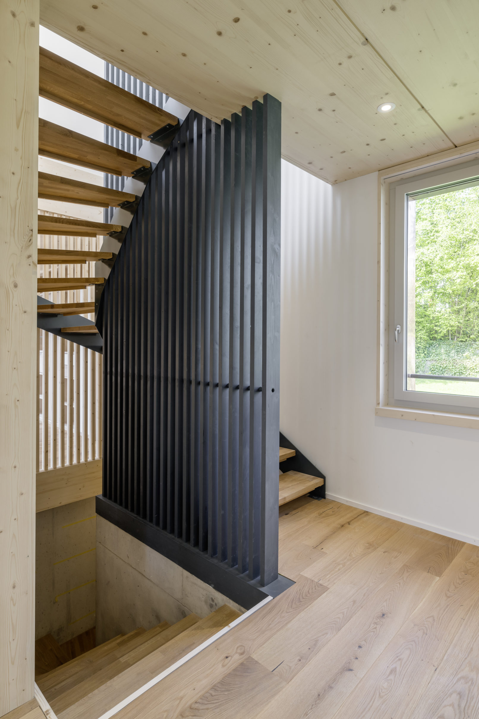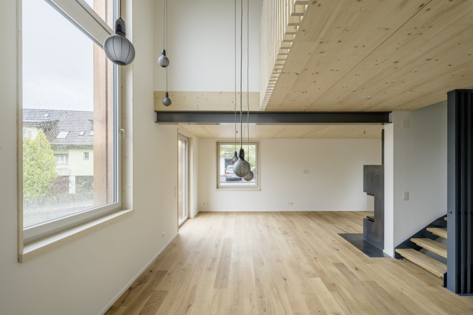 Im Inneren sind die Fichtenholzdecken, Fensterleibungen, Innentüren und Schreinerarbeiten lediglich transparent lasiert, oder in einem kräftigen Blauton gestrichen worden, um das «Wohnen im Holz» erlebbar zu machen.