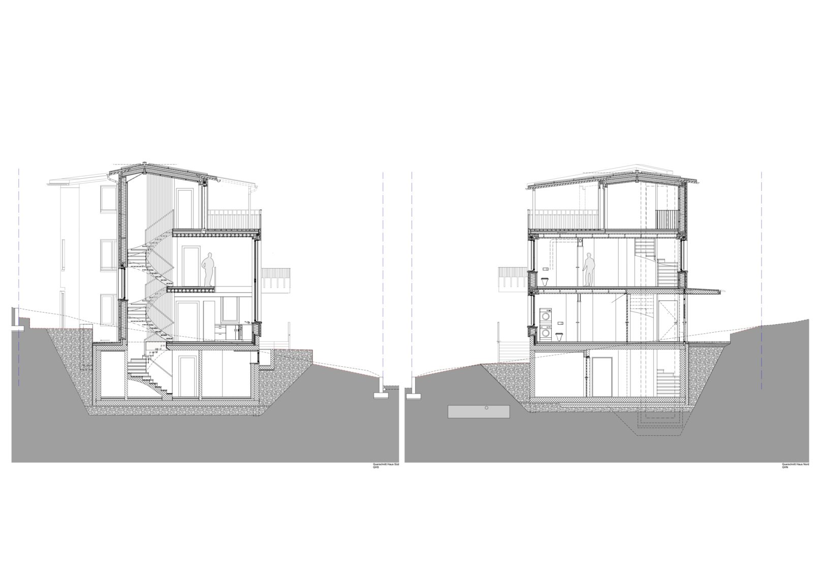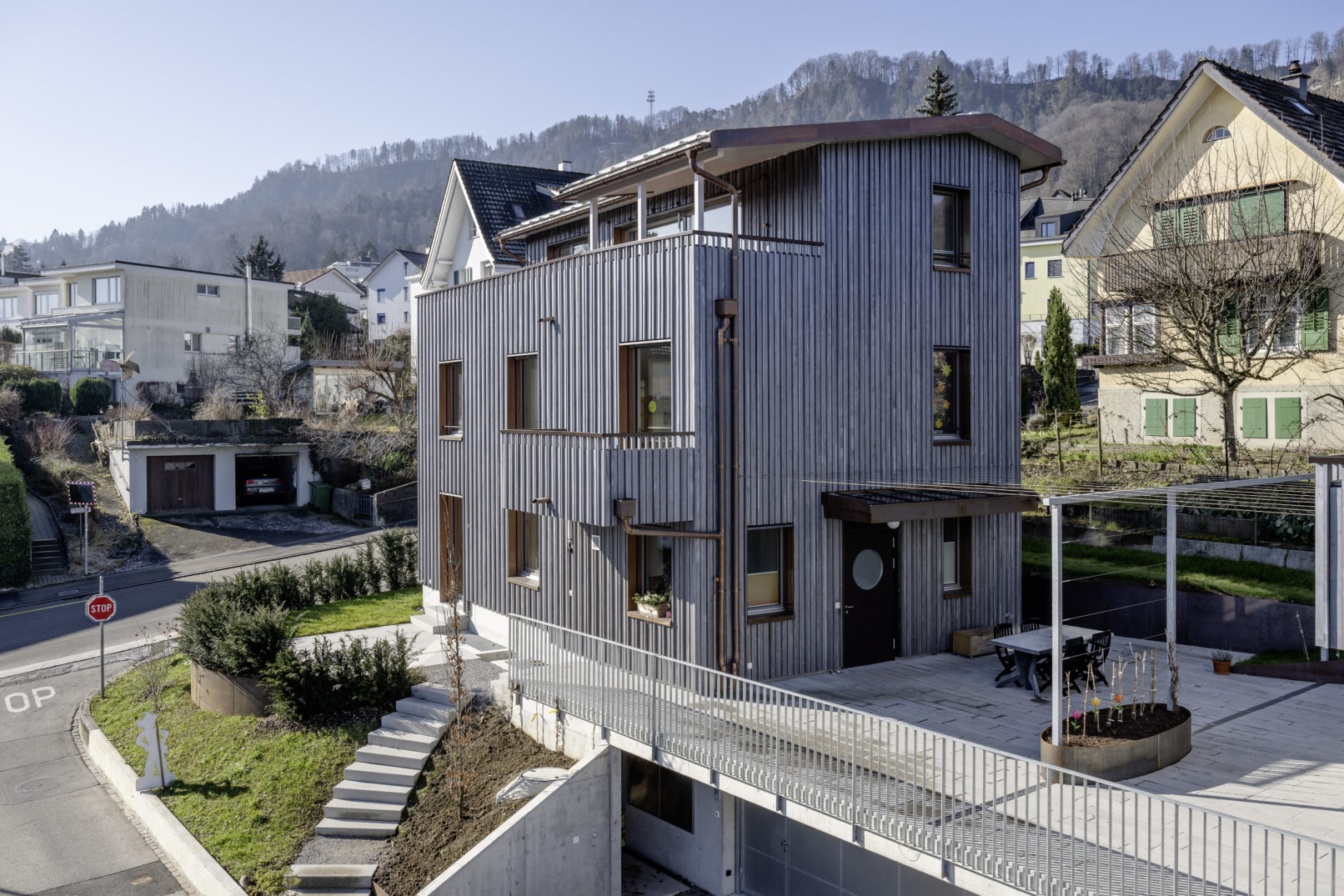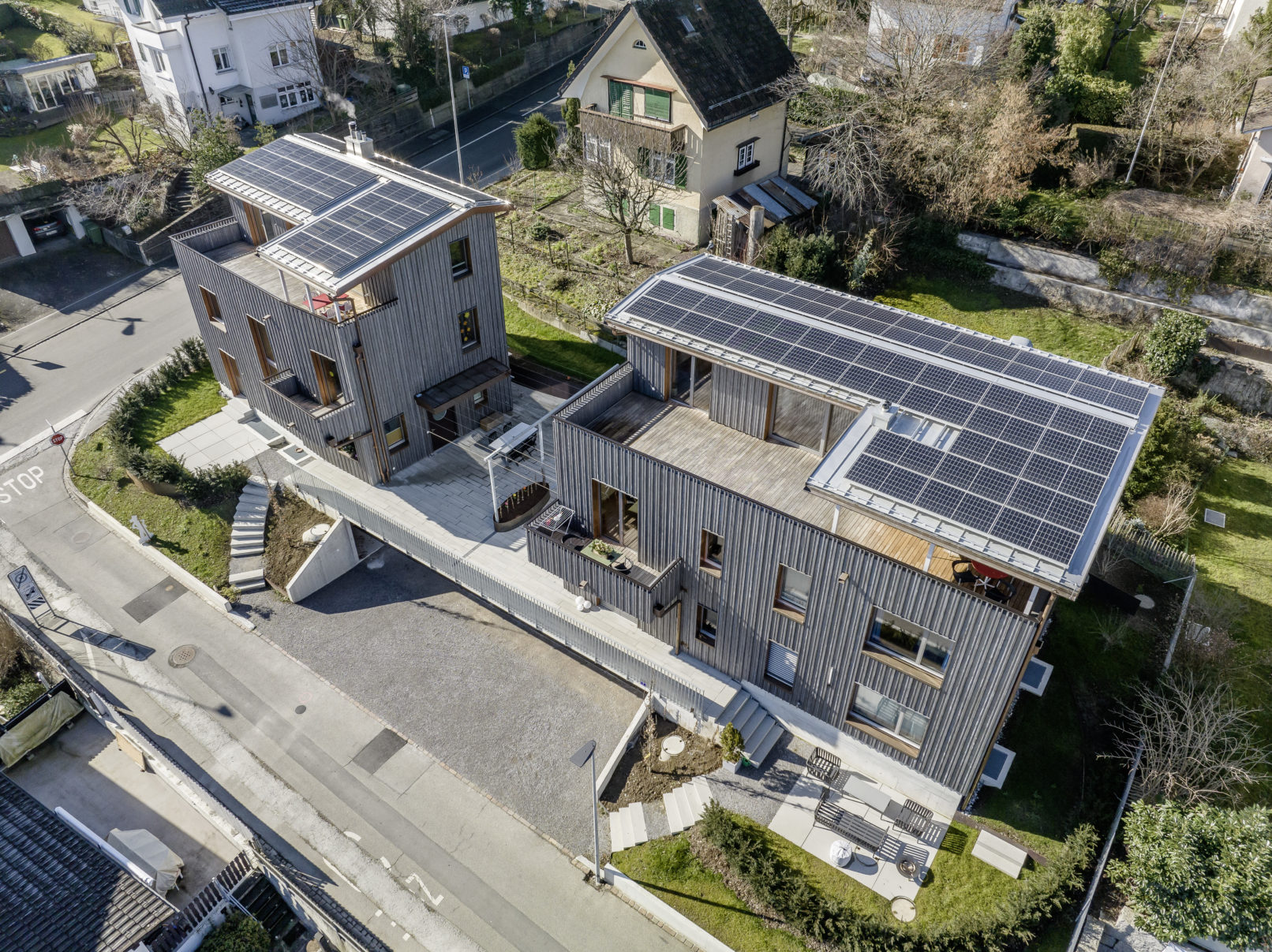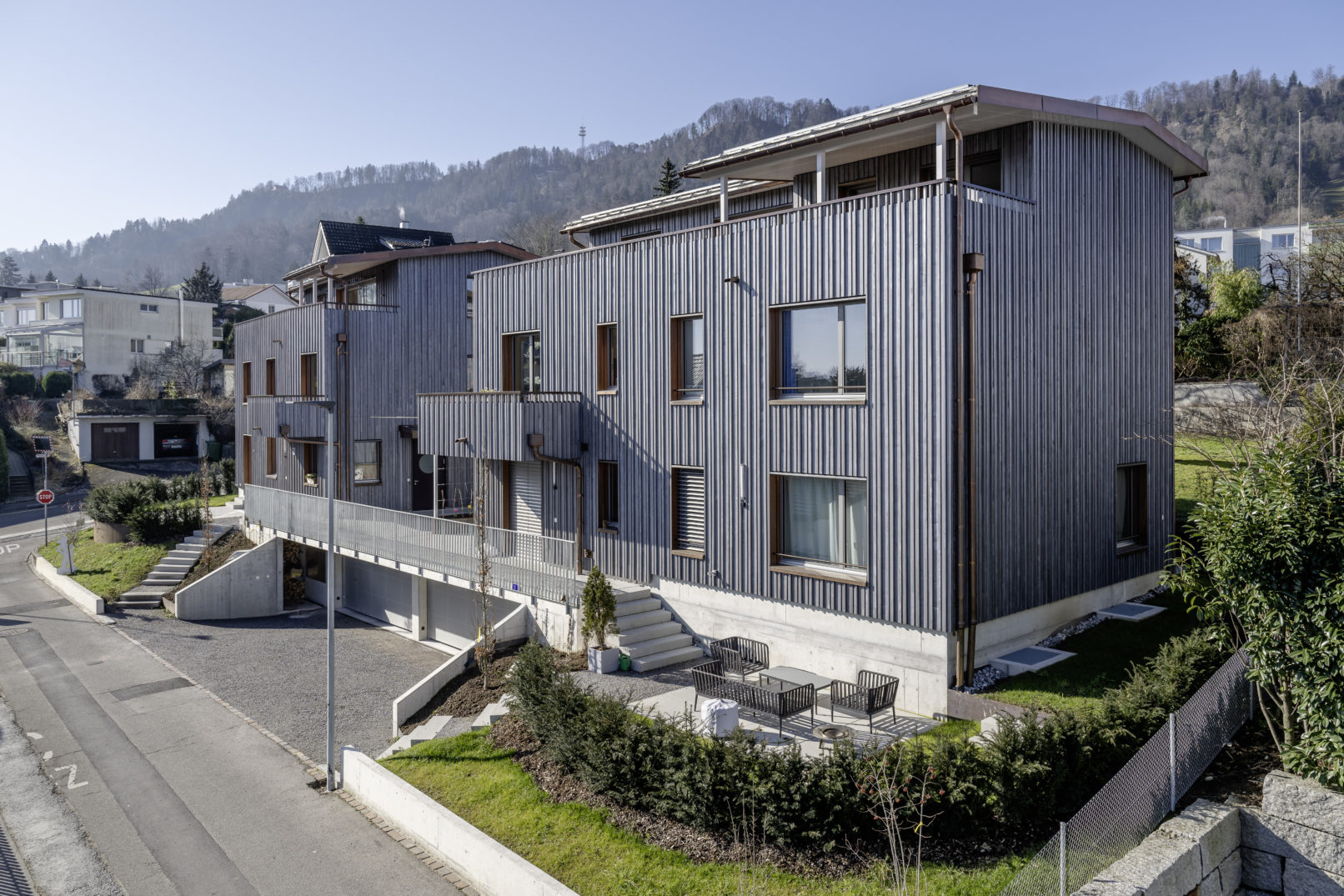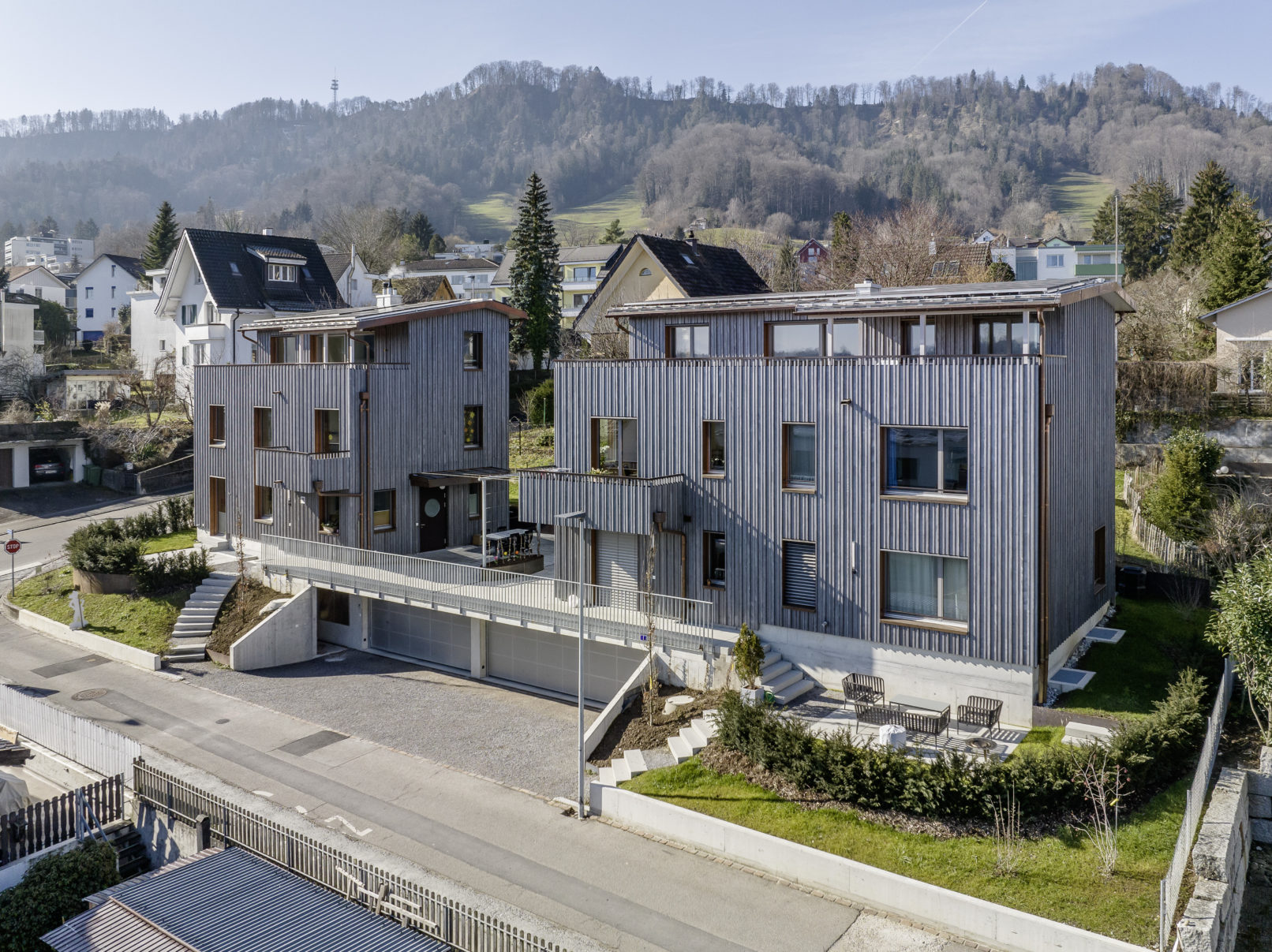 Fertiggestellt! Neubau zweier Holzbauten mit drei Wohnungen und gemeinsamen Untergeschoss.