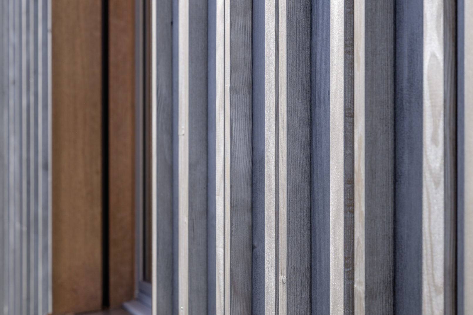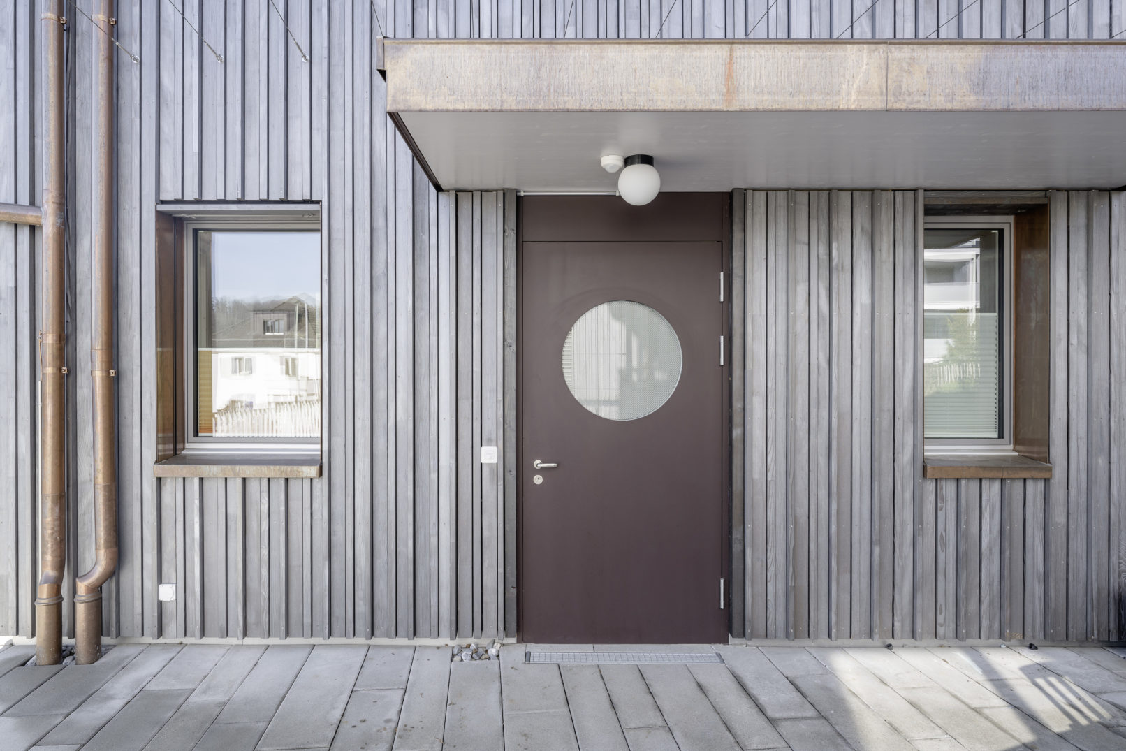 Wir durften dieses Projekt von der ersten Machbarkeitsstudie bis zur Inbetriebnahme betreuen. Die beiden dunklen Volumen aus einer vorvergrauten, und in der Tiefe variierenden Vertikalverschalung stehen auf einem gemeinsamen Sichtbetonsockel.